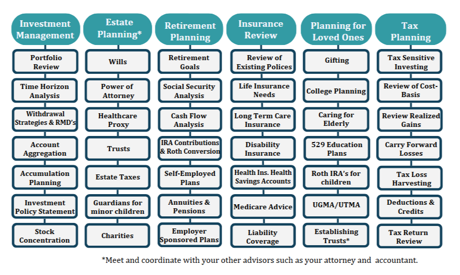 Feel free to ask us about any financial matter, not just your investments. For example, selling a home, changing jobs, buying a sailboat, buying a car, going on a safari or financing a child’s education.